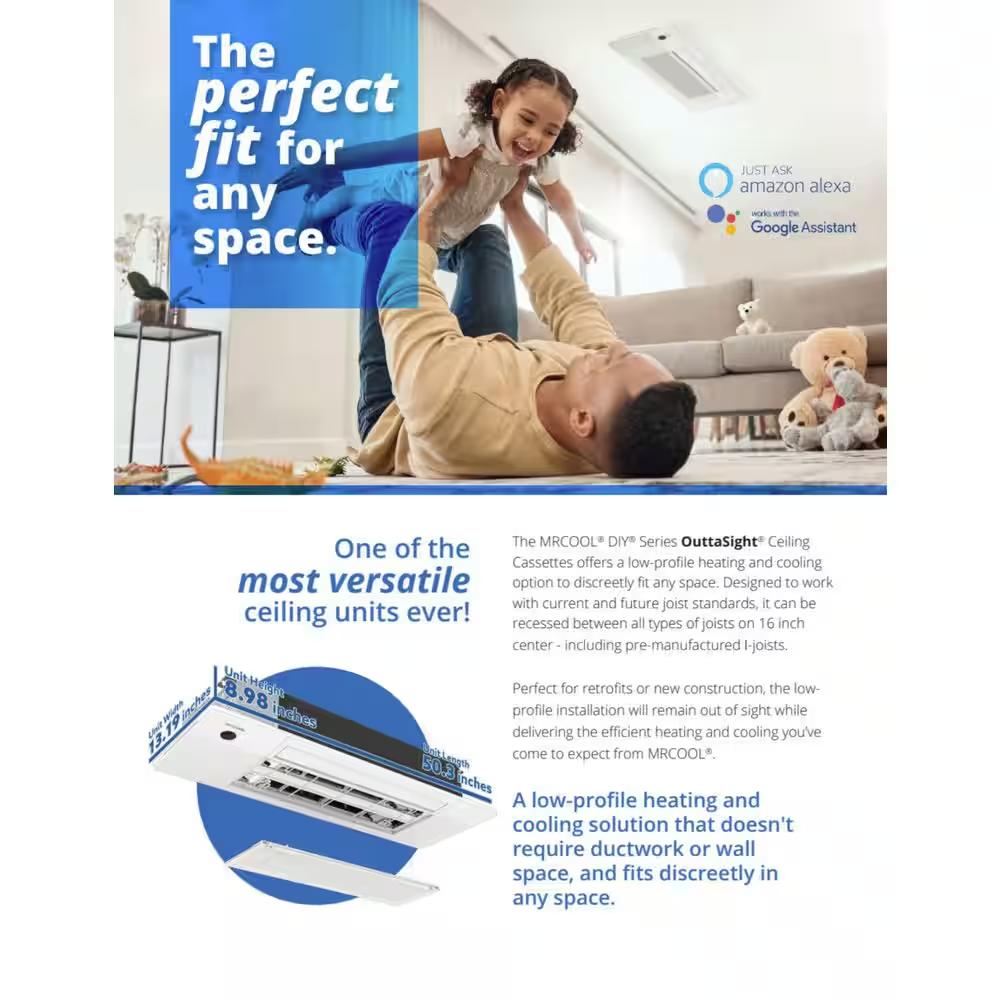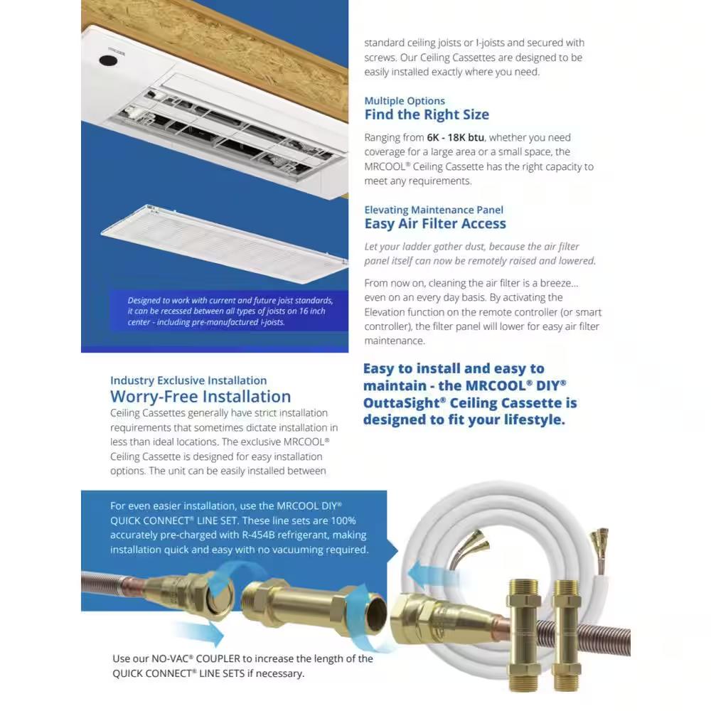 The 5th Generation MRCOOL® DIY® Series OuttaSight® 6K BTU 230V One-Way Ceiling Cassette is a powerful and efficient climate control solution for spaces up to 200 sq. ft. Engineered for easy DIY installation, this system eliminates the need for specialized tools, making setup simple, cost-effective, and hassle-free. Designed to integrate seamlessly into multi-zone configurations, the cassette fits neatly between 16” ceiling joists, including pre-manufactured I-joists, for a clean, flush-mounted appearance. Unlike traditional ceiling cassettes that require extensive ductwork or inconvenient wall space, rethis unit offers a flexible installation ideal for both new builds and retrofit projects. The cassette pairs effortlessly with the MRCOOL® DIY® Quick Connect® line set, which comes pre-charged with R-454B, an environmentally friendly refrigerant that eliminates the need for vacuuming (MRCOOL® DIY® Quick Connect® line set sold separately). Advanced filtration enhances indoor air quality, while the Elevation function allows easy filter maintenance by lowering the panel for convenient access. With quiet operation and multiple control options—including a wireless remote, SmartHVAC app, and voice commands via Amazon Alexa and Google Assistant—this system offers personalized comfort. Backed by an industry-leading limited lifetime warranty, a 7-year compressor warranty, and a 5-year parts warranty, the MRCOOL® DIY® Outtasight® Ceiling Cassette delivers long-term reliability, advanced technology, and year-round comfort.