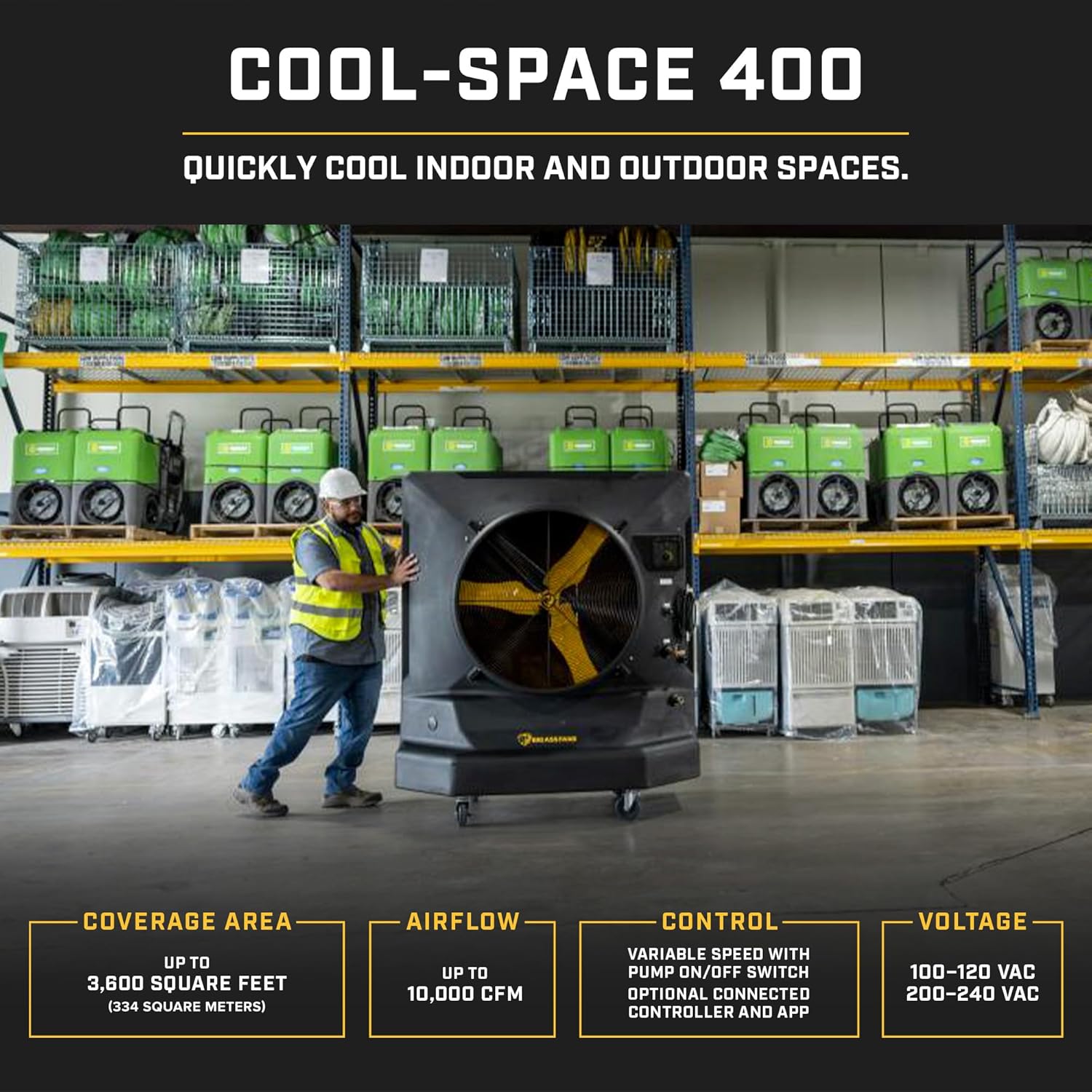 - New Motor. New Blades. New Terrain: Want a swamp cooler with a little more swagger? Then the all-new Cool-Space® 400 might be the perfect evaporative cooler for you. Armed with a re-designed motor and new aerodynamic fan blades, Cool-Space 400 delivers efficient, nearly silent airflow for up to 10 hours in spaces up to 3600 square feet. Now available with an All-Terrain package, Cool-Space 400 is the most durable, powerful and portable swamp cooler on the planet!