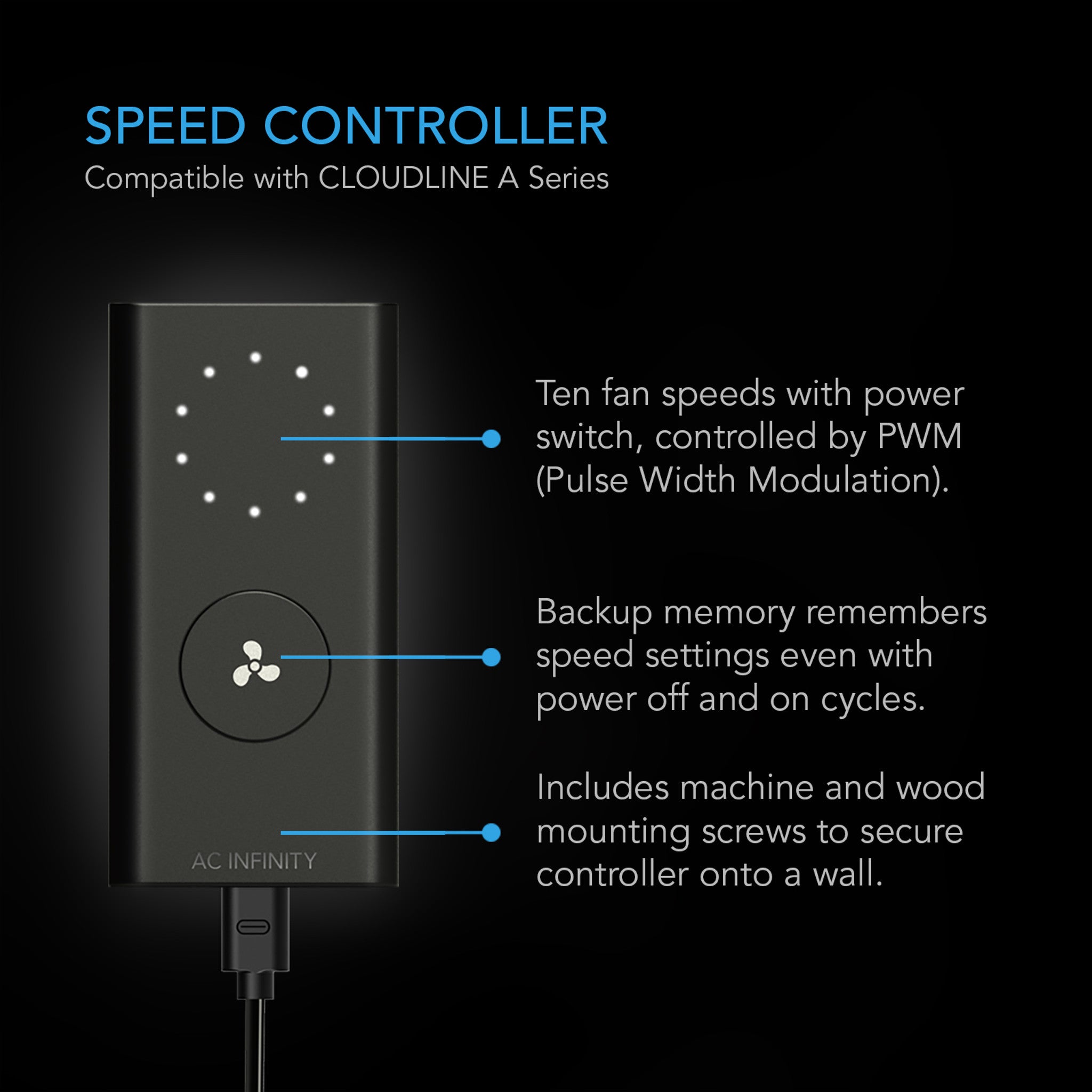 A 10-speed fan controller is paired with this inline fan to optimize airflow levels and noise in many applications. The fan’s PWM controls enable it to smoothly set fan speeds and operate at extremely low RPMs with no motor noise. Along with this wired speed controller, the CLOUDLINE is also compatible with the following controllers: