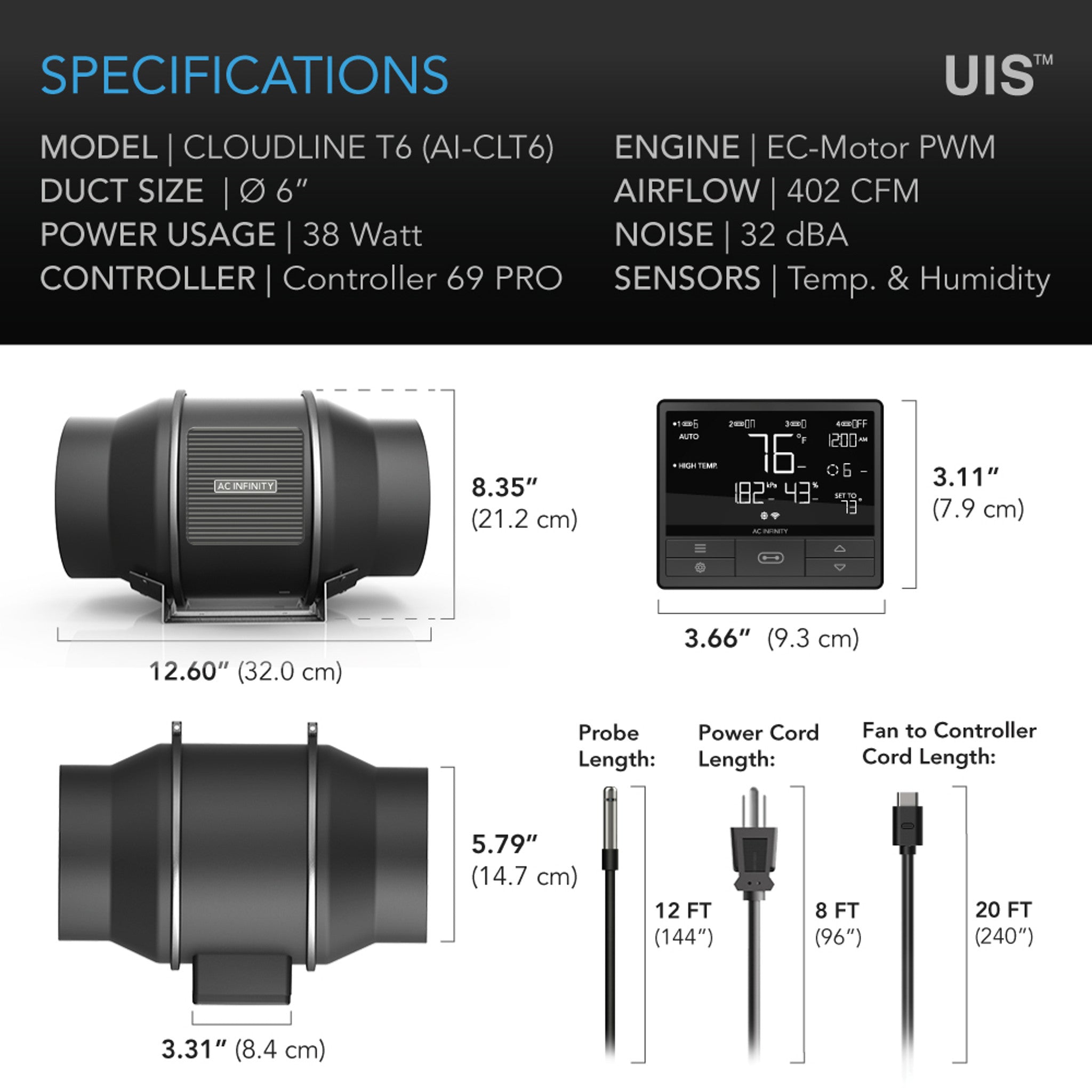 AC Infinity CLOUDLINE PRO T6, Quiet Inline Duct Fan System With Temperature Humidity Vpd Controller, 6-Inch