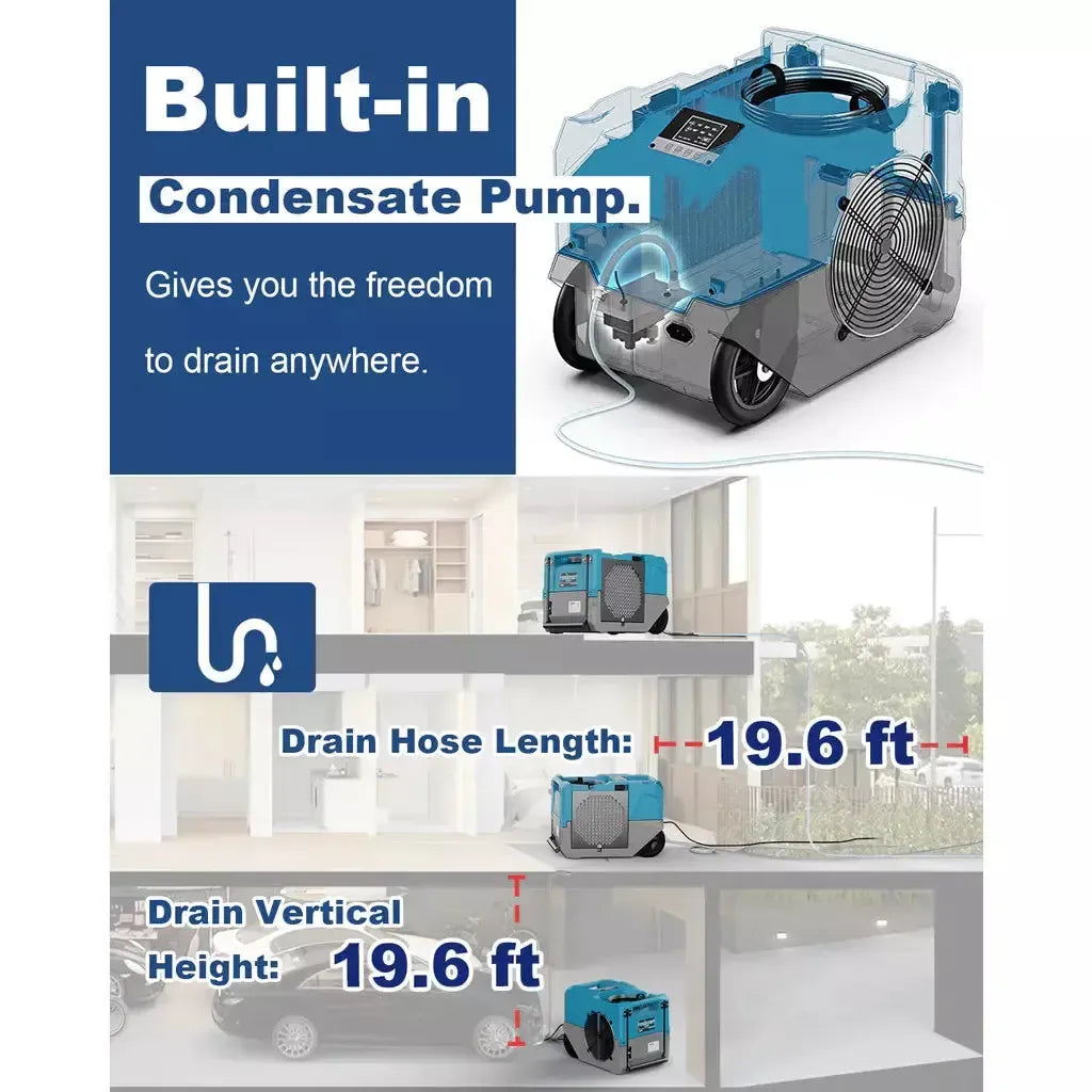 Rotomolded housing, practically Indestructible. 2 Wheels, and Fold-down Handle, Easy to transport anywhere high-efficiency dehumidification is needed. The water pump basin is attached to a 19.6' hose for the removal of condensate across wide spaces.