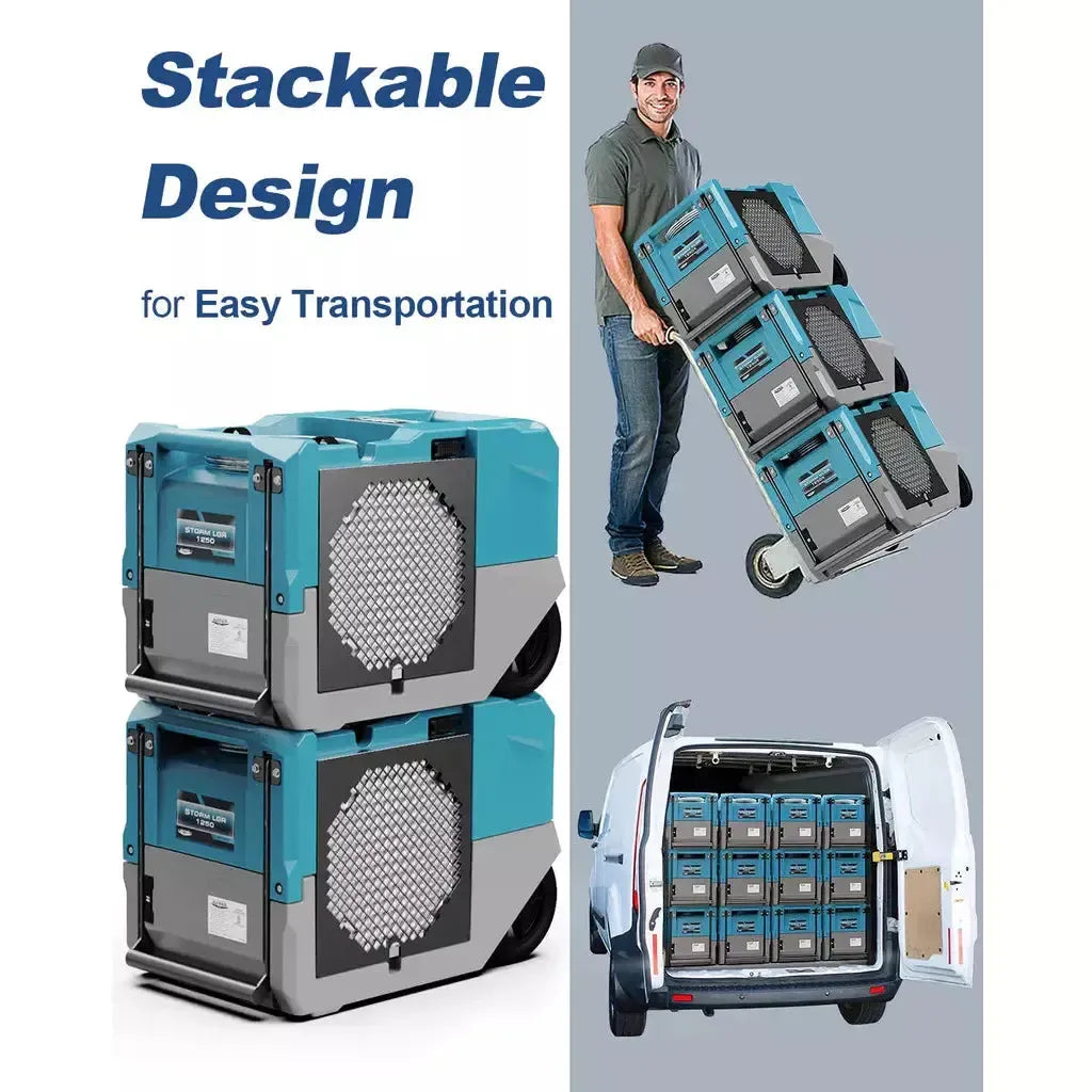 Design with humanized: Because of its compact size, Retractable Handle with wheels for transport, superior stacking features, and easy service access. Onboard storage for 19.6’ power cord and 19.6' condensate hose. The standard filter is a MERV-8 high-efficiency filter.