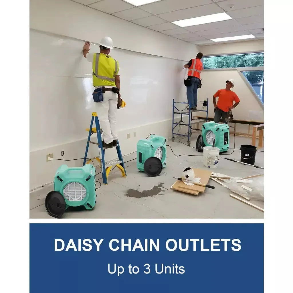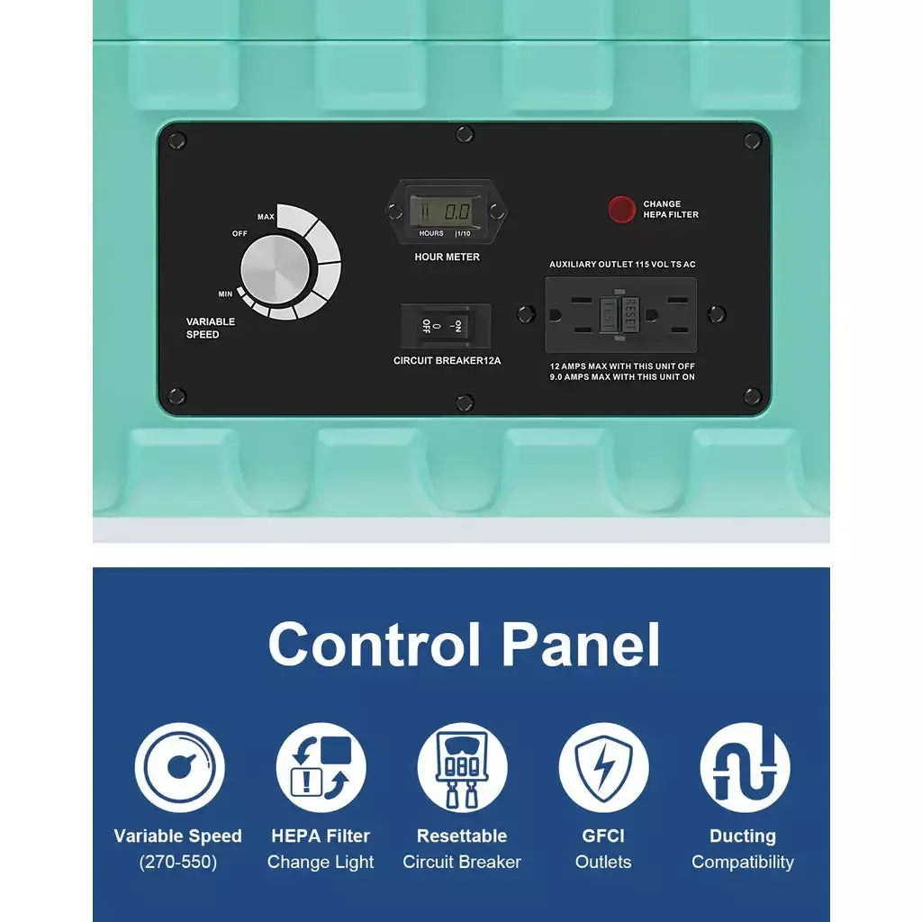Multiple Features: It is a bigger air intake than any competitor's units, and Airflow is up to 550 CFM. This Air machine has a Filter change light, an hour meter display, a daisy chain GFCI Duplex, Stackable, and variable speed control and regulator. These features allow you to keep track of the conditions of your work environment. Inlet 16". Outlet 8".