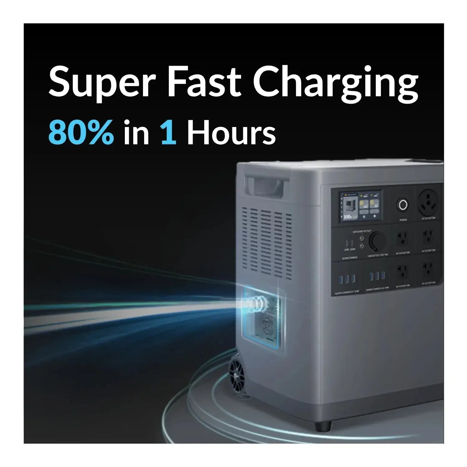 The battery percentage could reach 80% in 1 hour with Mango Power E fast charging cable recharging and 100% in 1.5 hours. (30A fast charging cable is needed. Please be noticed that the setting of Max AC Input Current should be set to 30A.)